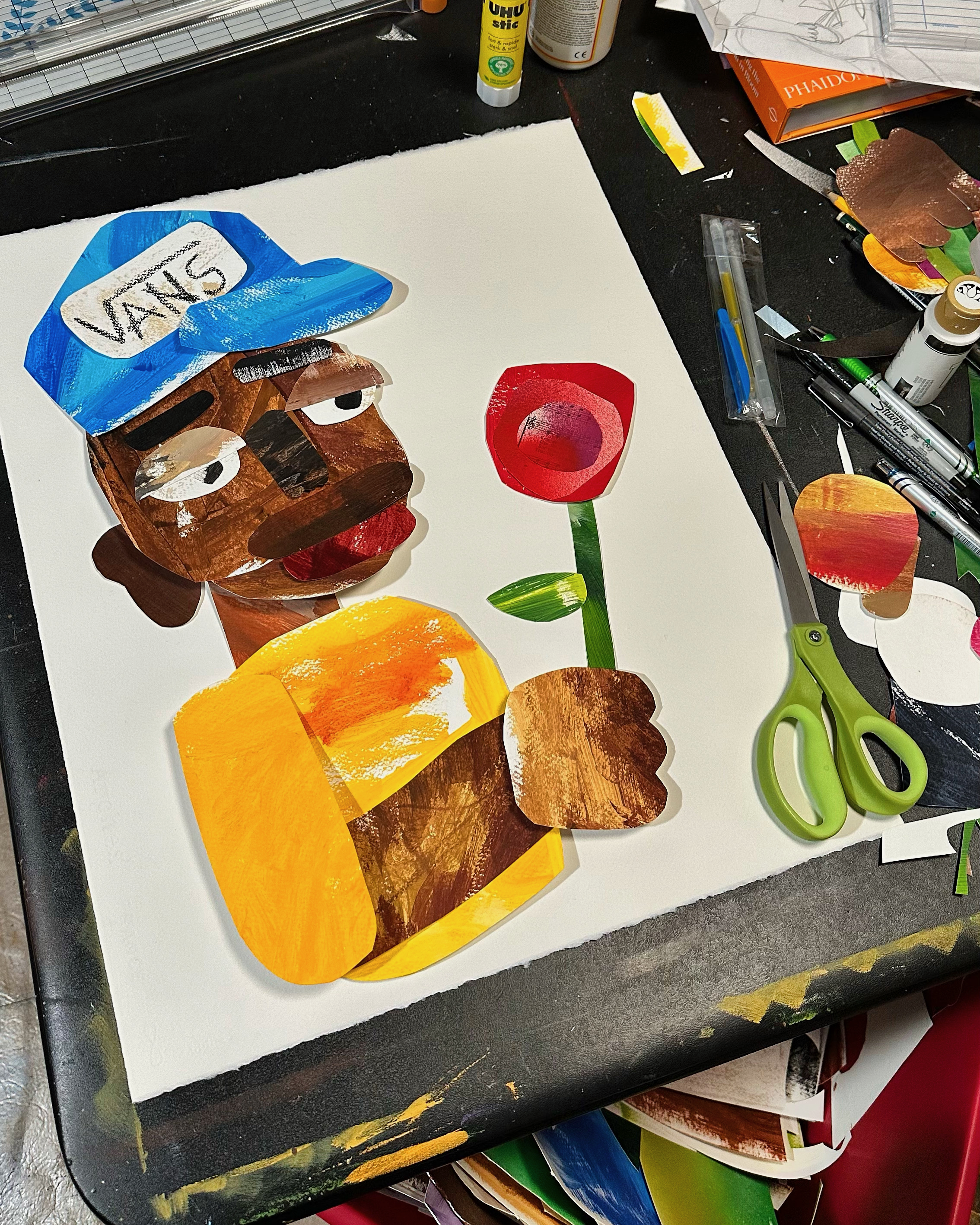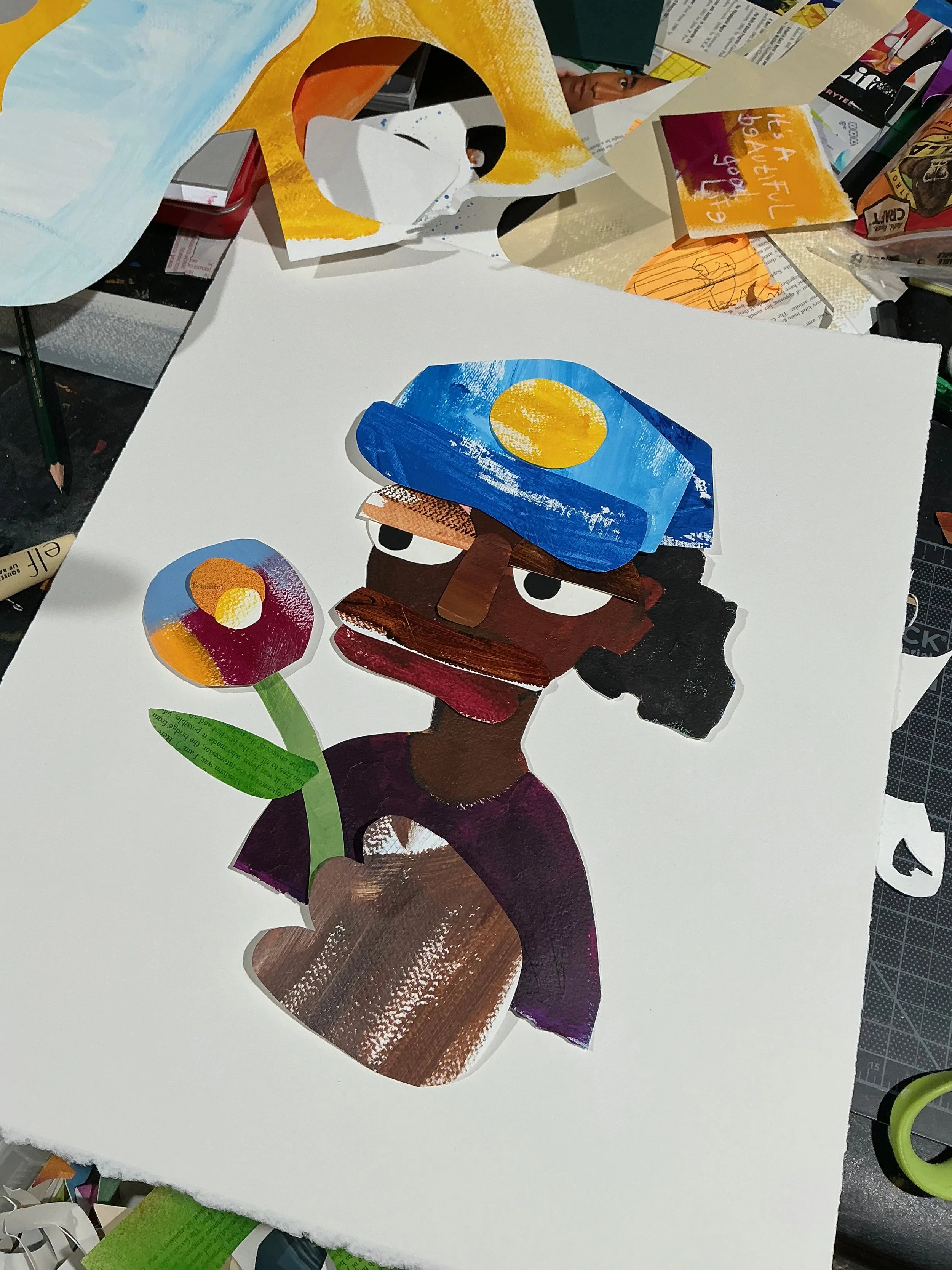 Through painted paper collage and mixed media portraiture, I create images that center Black life in its fullness. Children at play. Athletes in motion. Readers engrossed in text. Figures surrounded by flowers that signal growth, inheritance, and becoming.